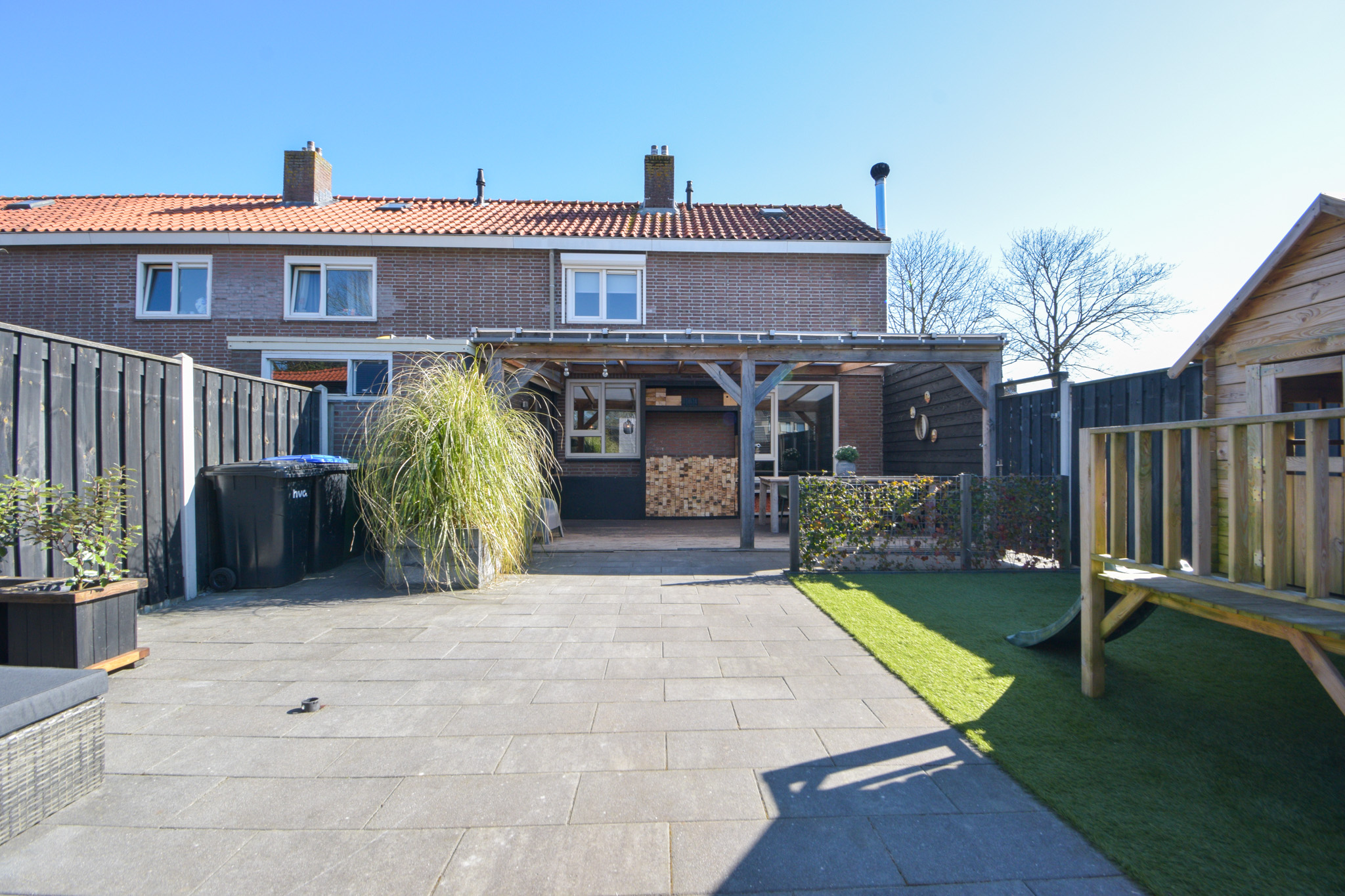 Diepe achtertuin gelegen op het zuidwesten met overkapping over de gehele breedte van de woning en dubbele schuur/berging met houtopslag