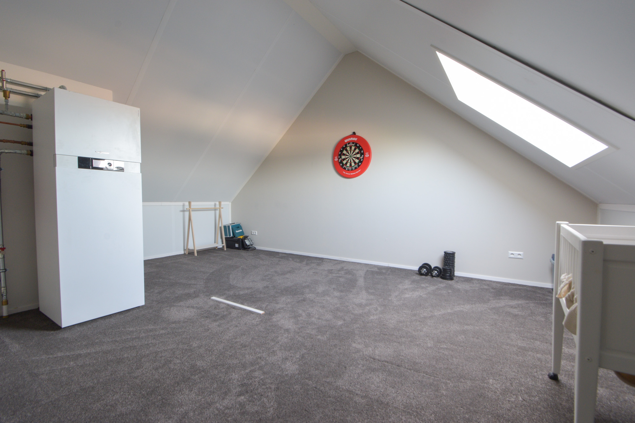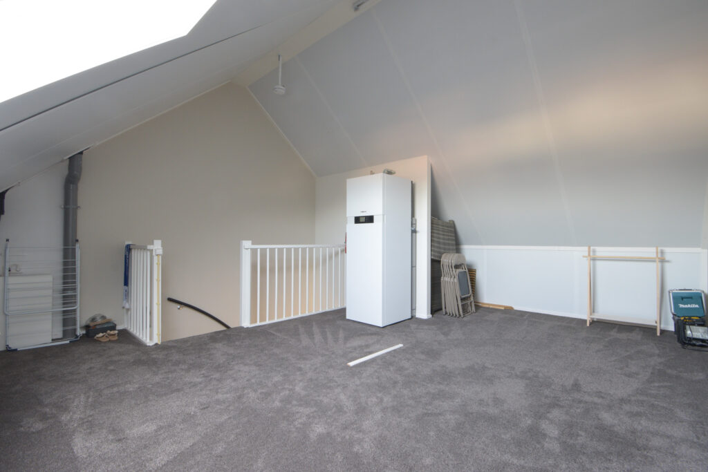 2e verdieping: door vaste trap te bereiken hoge en open zolder met opstelling warmtepomp en omvormer en mogelijkheid voor eventueel 2 extra slaapkamers.