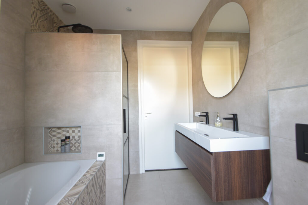 1e verdieping: overloop, 3 slaapkamers waarvan 2 met elektrisch bedienbare rolluiken en ouderslaapkamer voorzien van luxe kastenwand, toegang naar plat en riante en luxe badkamer voorzien van duoligbad, douche, dubbele wastafel, toilet en spiegel met verlichting.