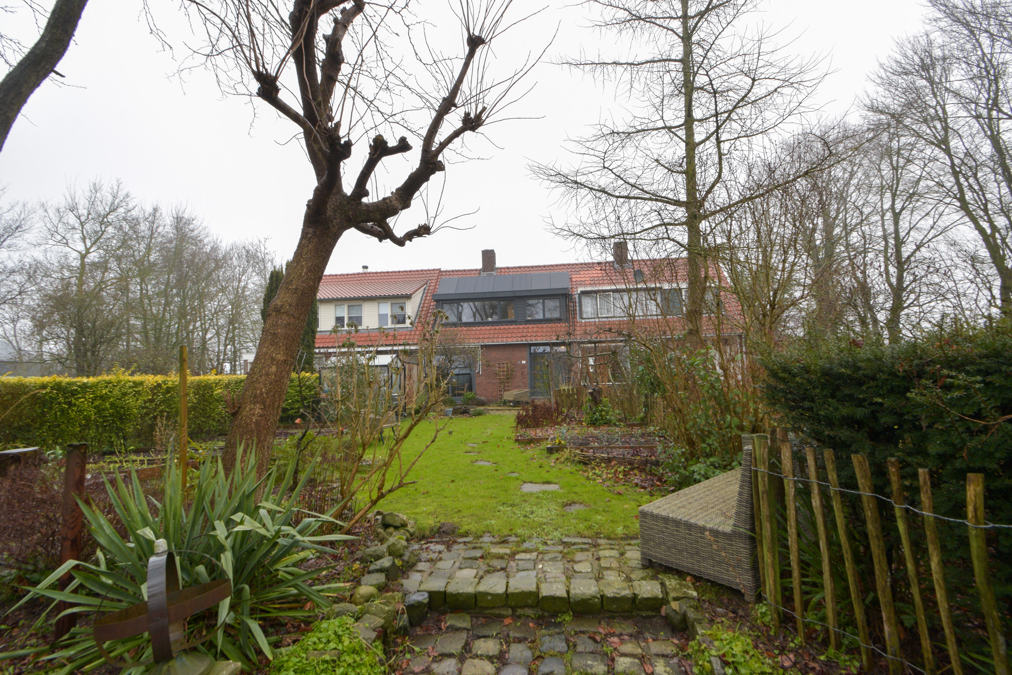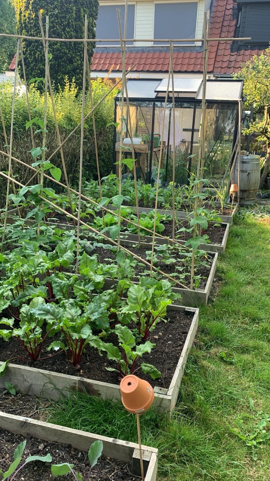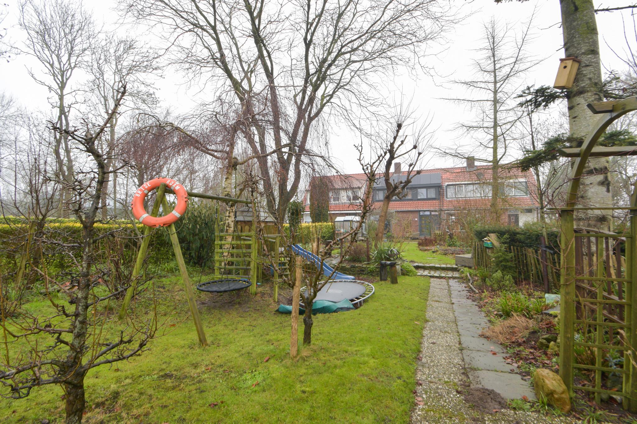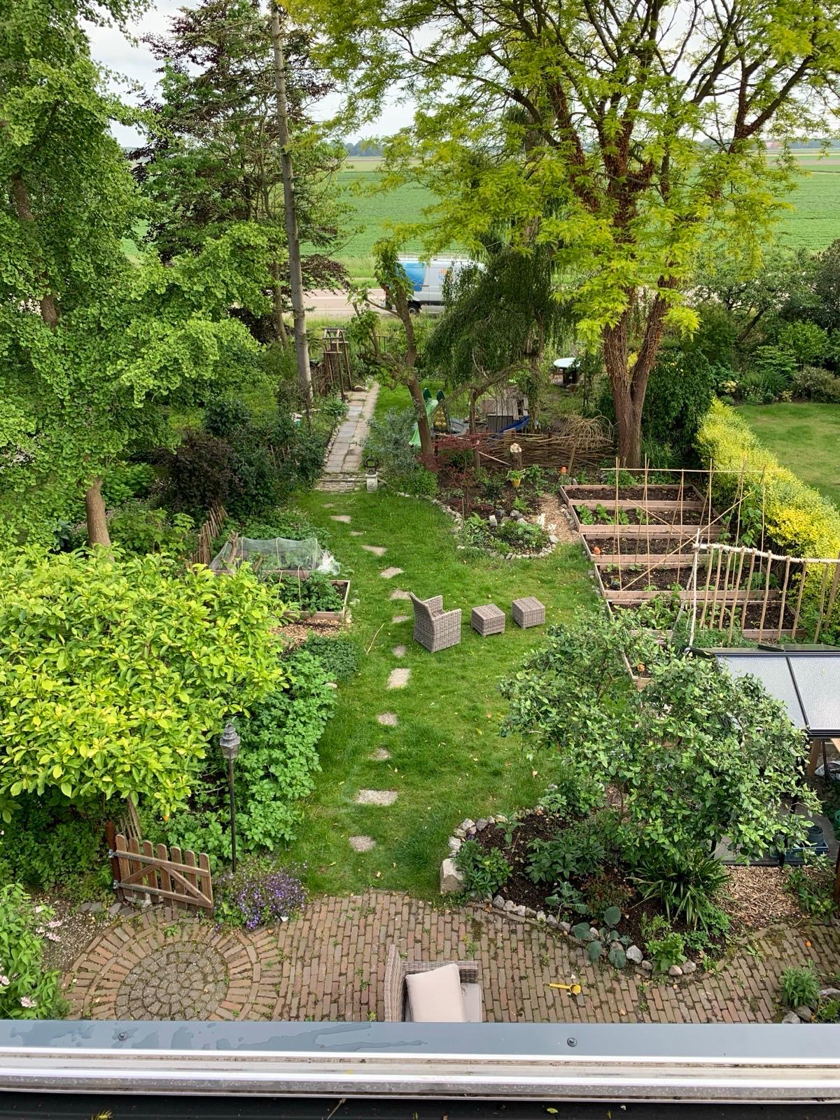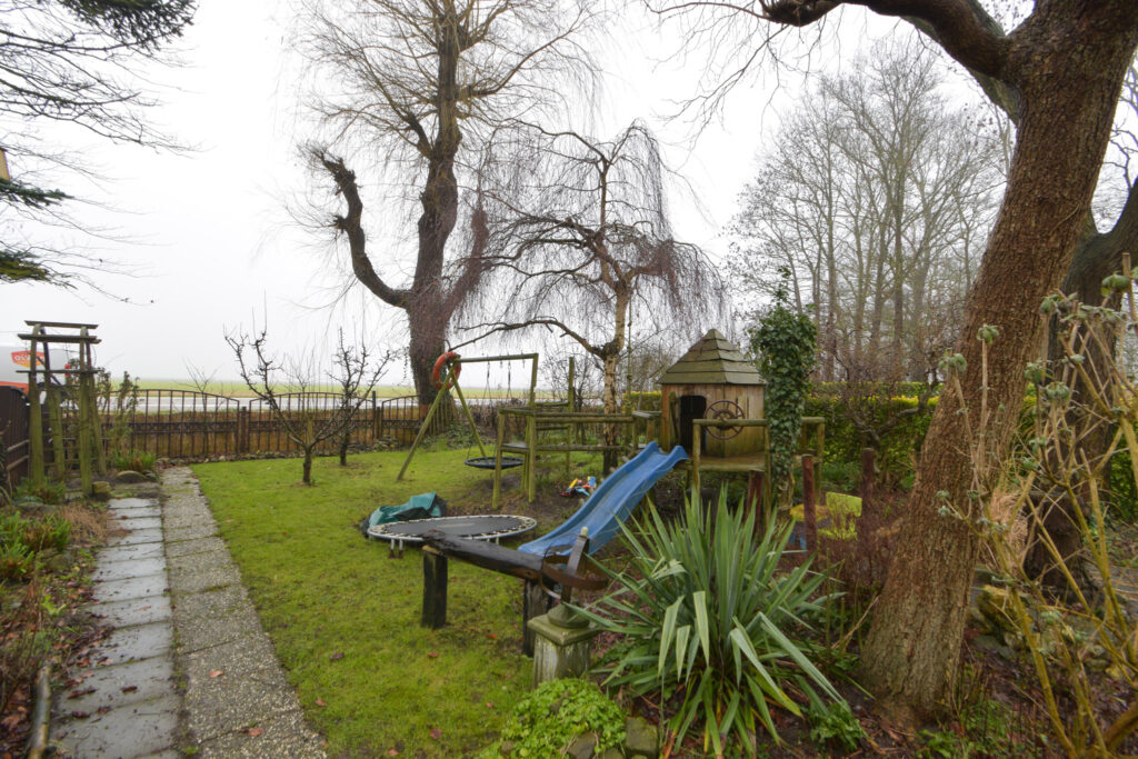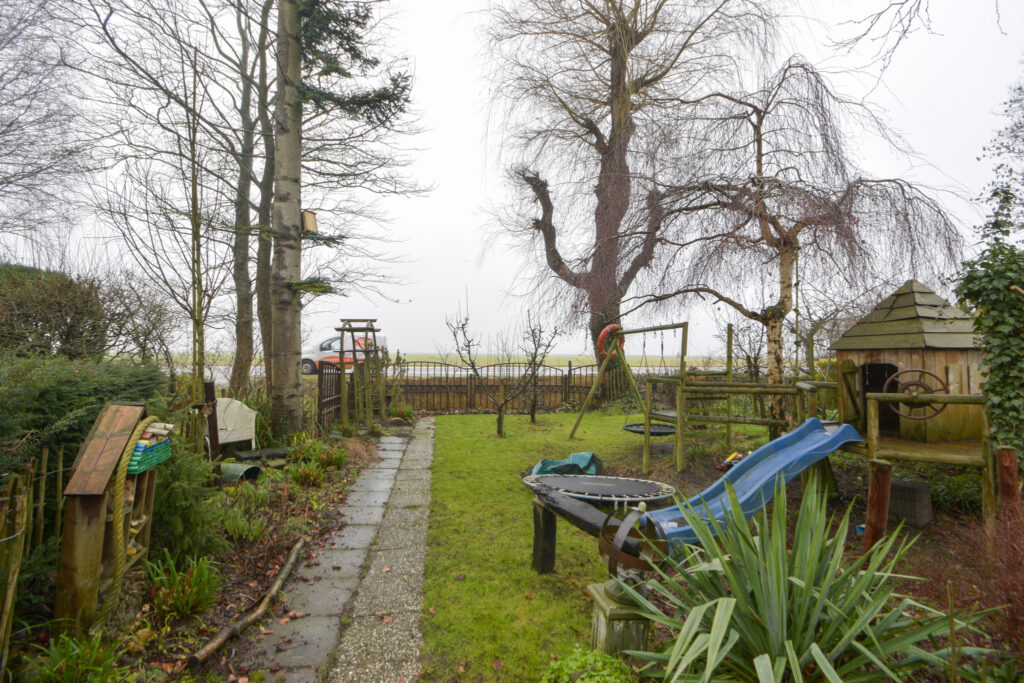 De voortuin is heerlijk diep, ligt op het zonnige zuiden en biedt vele mogelijkheden. Hier staan nu 4 appelbomen, twee perenbomen (stoof en hand) een aalbesstruik en een olijfboom. Ook staat hier een prachtige broeikas van het merk ACD, een multifunctioneel kinderspeeltoestel en een ingegraven trampoline.