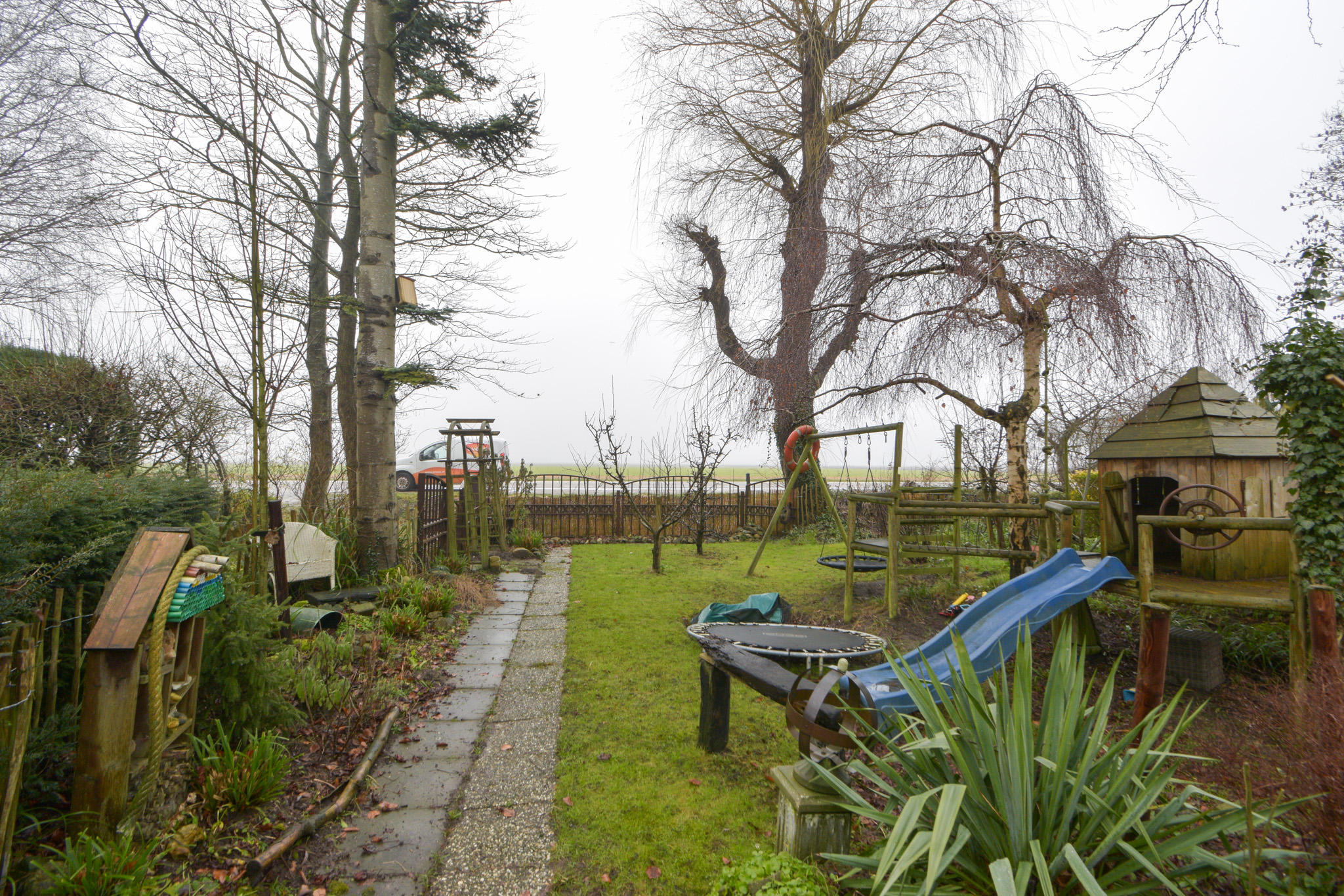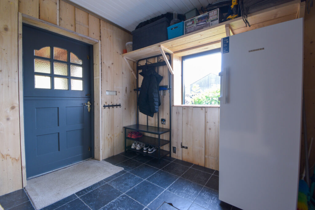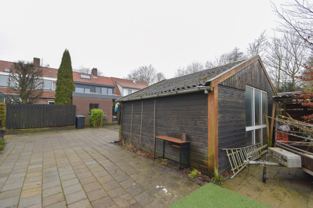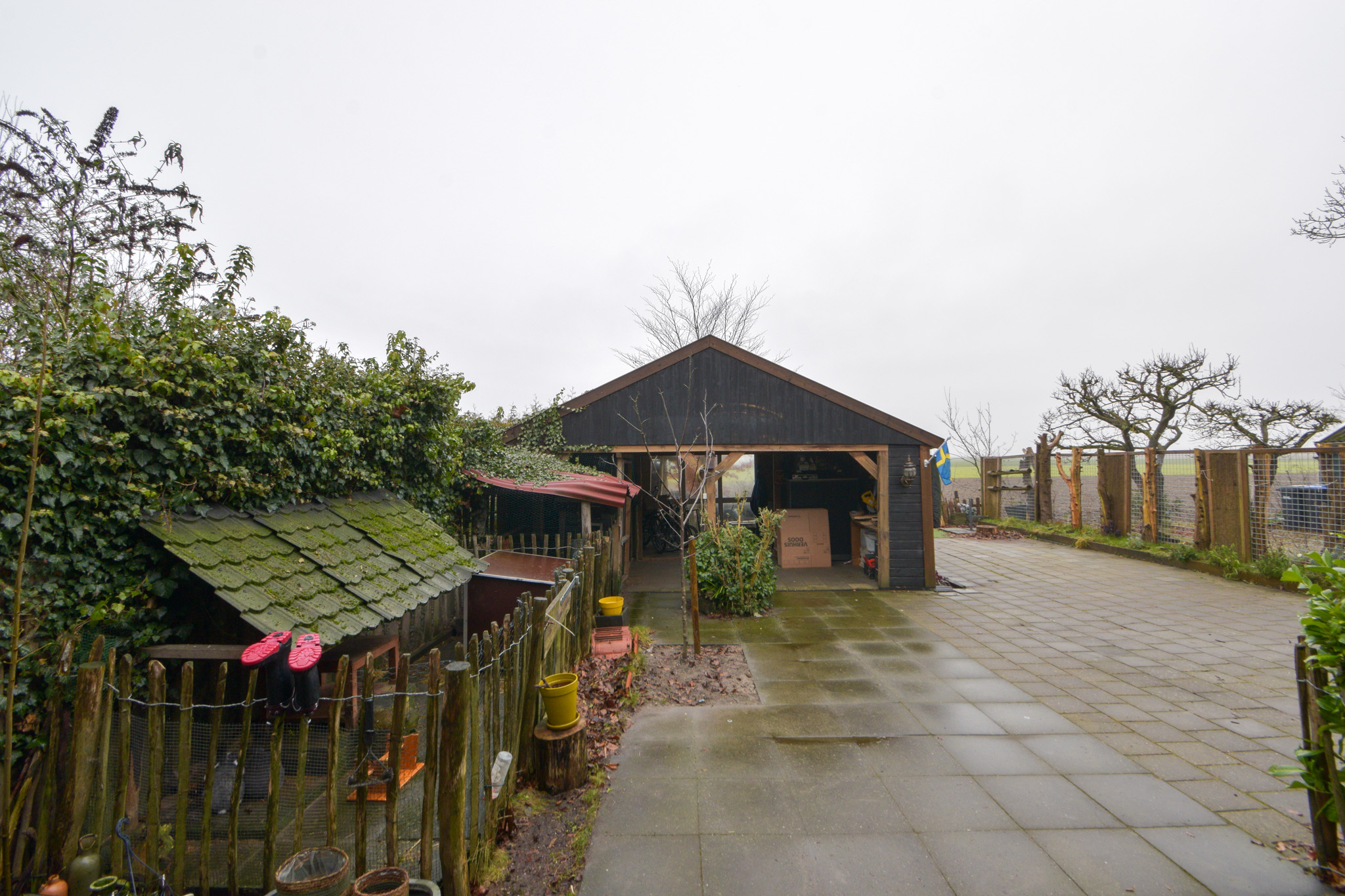 Aan de achterzijde (te bereiken per auto over het overpad van de buurvrouw) bevindt zich een forse en multifunctionele overkapping als schuur/berging en vanaf daar is er ver uitzicht over de velden.