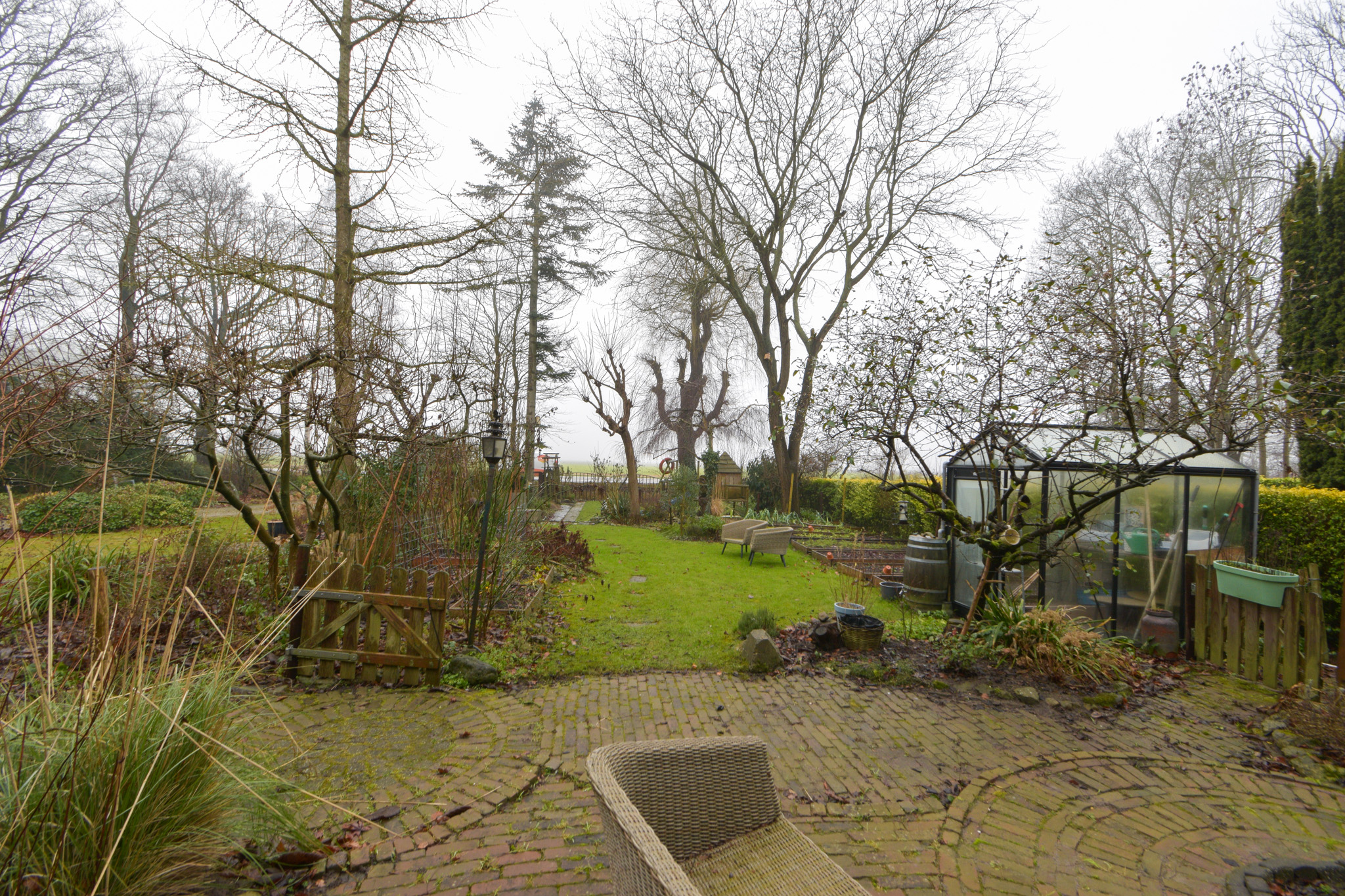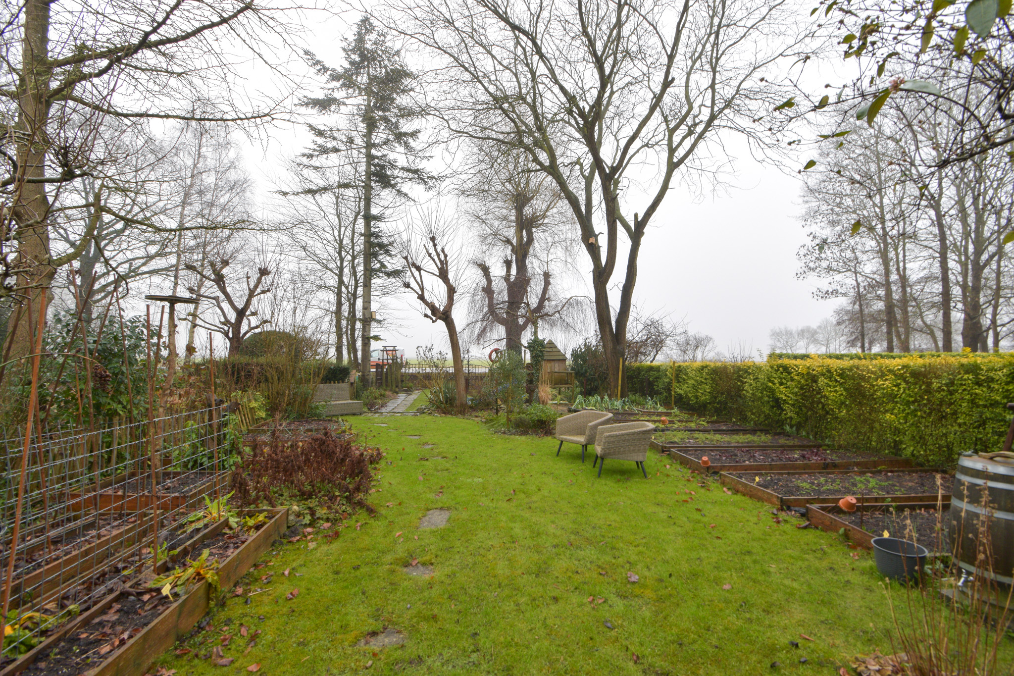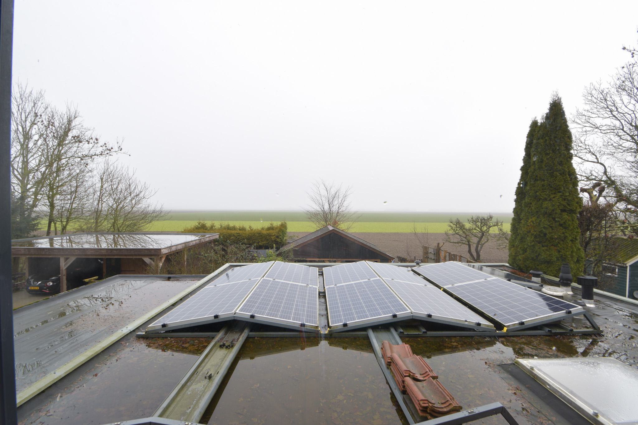 Aan de achterzijde (te bereiken per auto over het overpad van de buurvrouw) bevindt zich een forse en multifunctionele overkapping als schuur/berging en vanaf daar is er ver uitzicht over de velden.