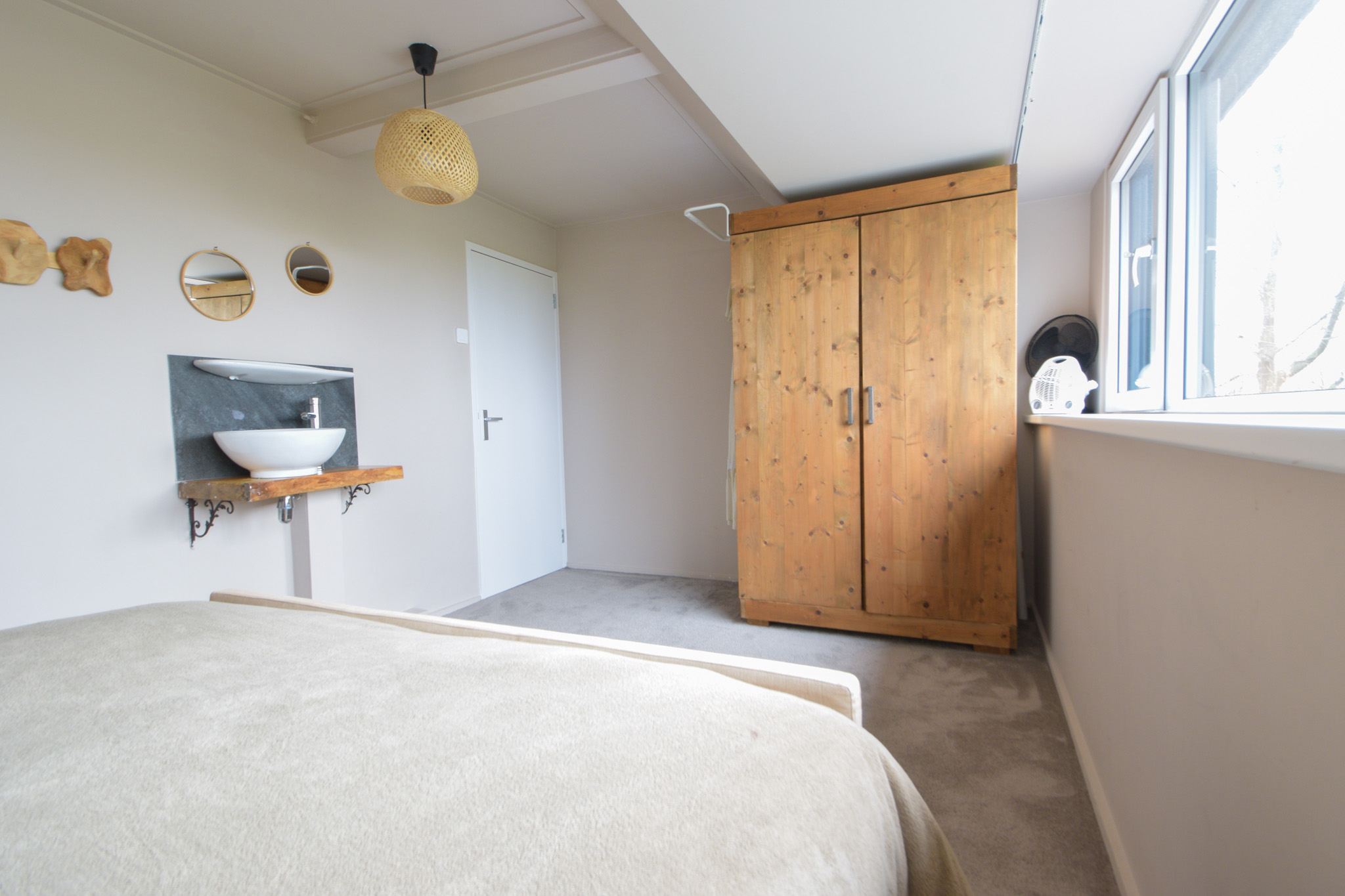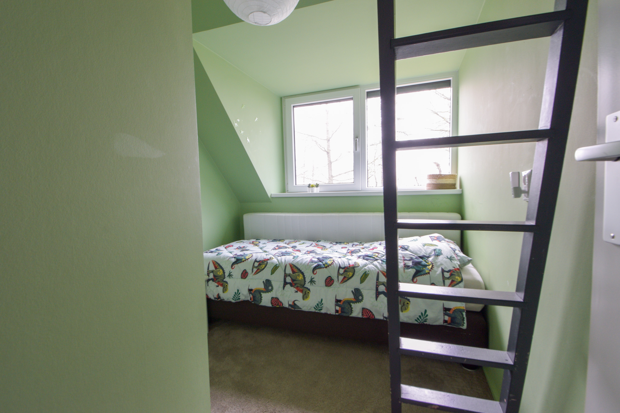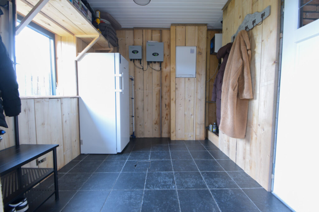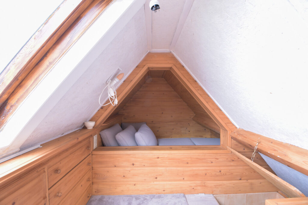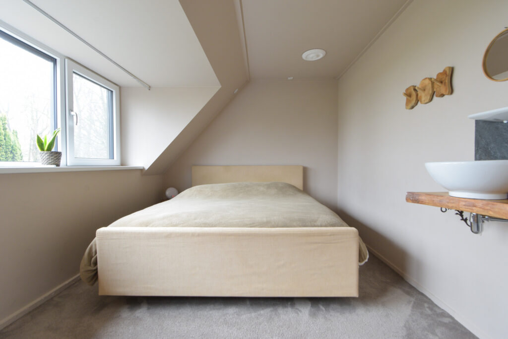 Vanaf één van die slaapkamers gaat een trapje naar de zolderverdieping waar een “kooi” is gerealiseerd als extra slaapplek.
