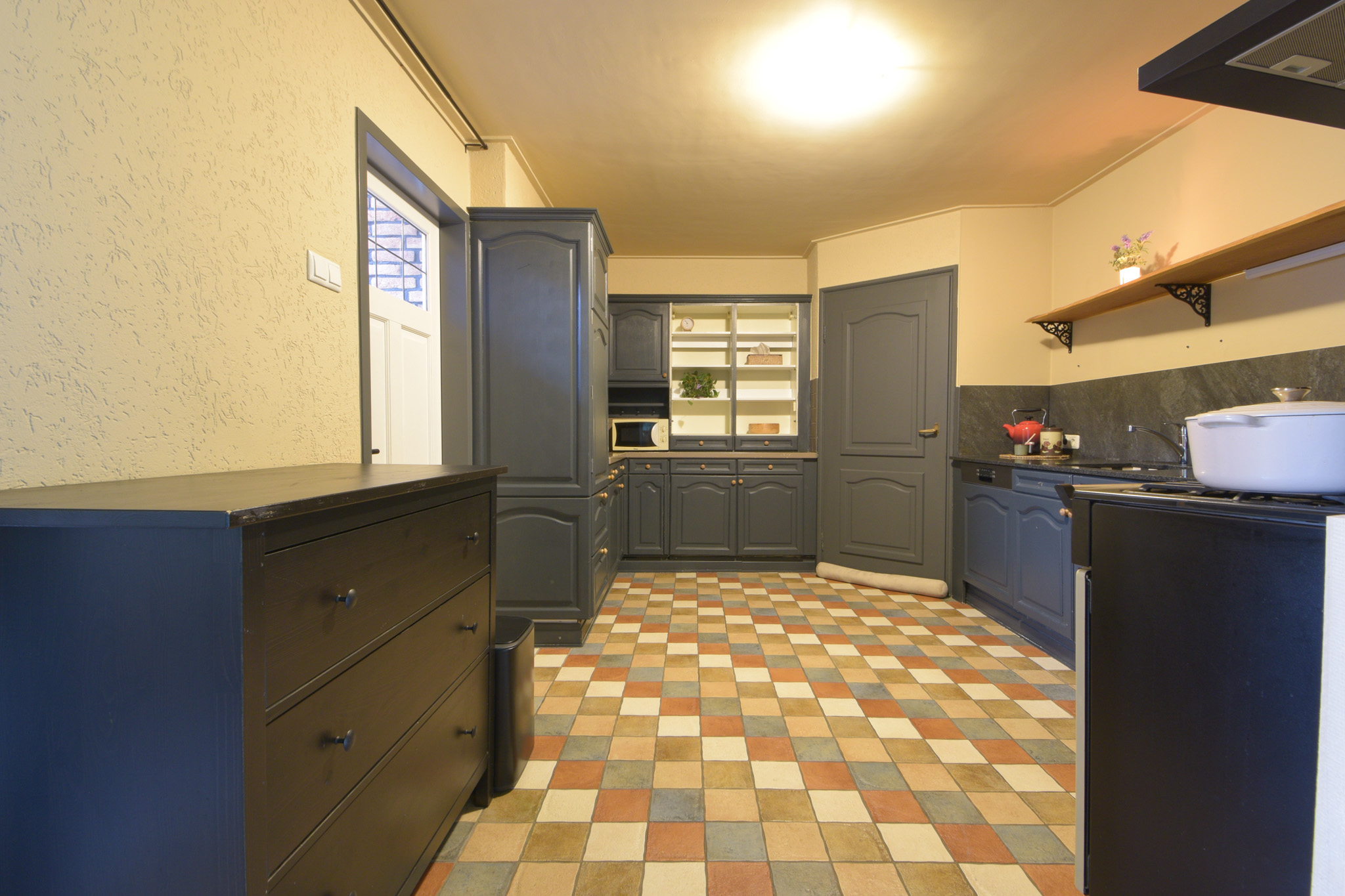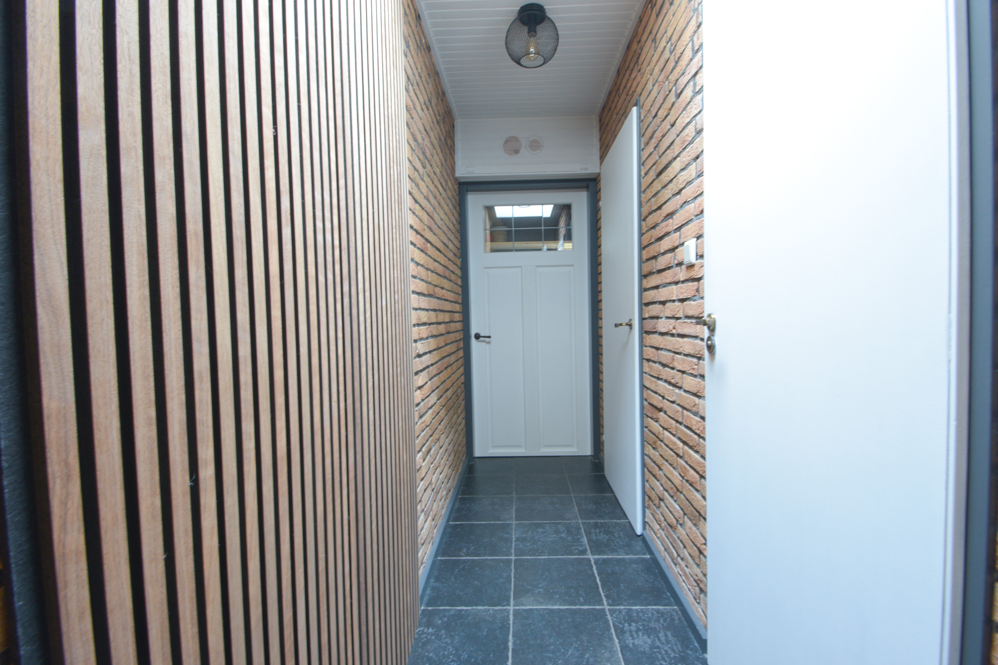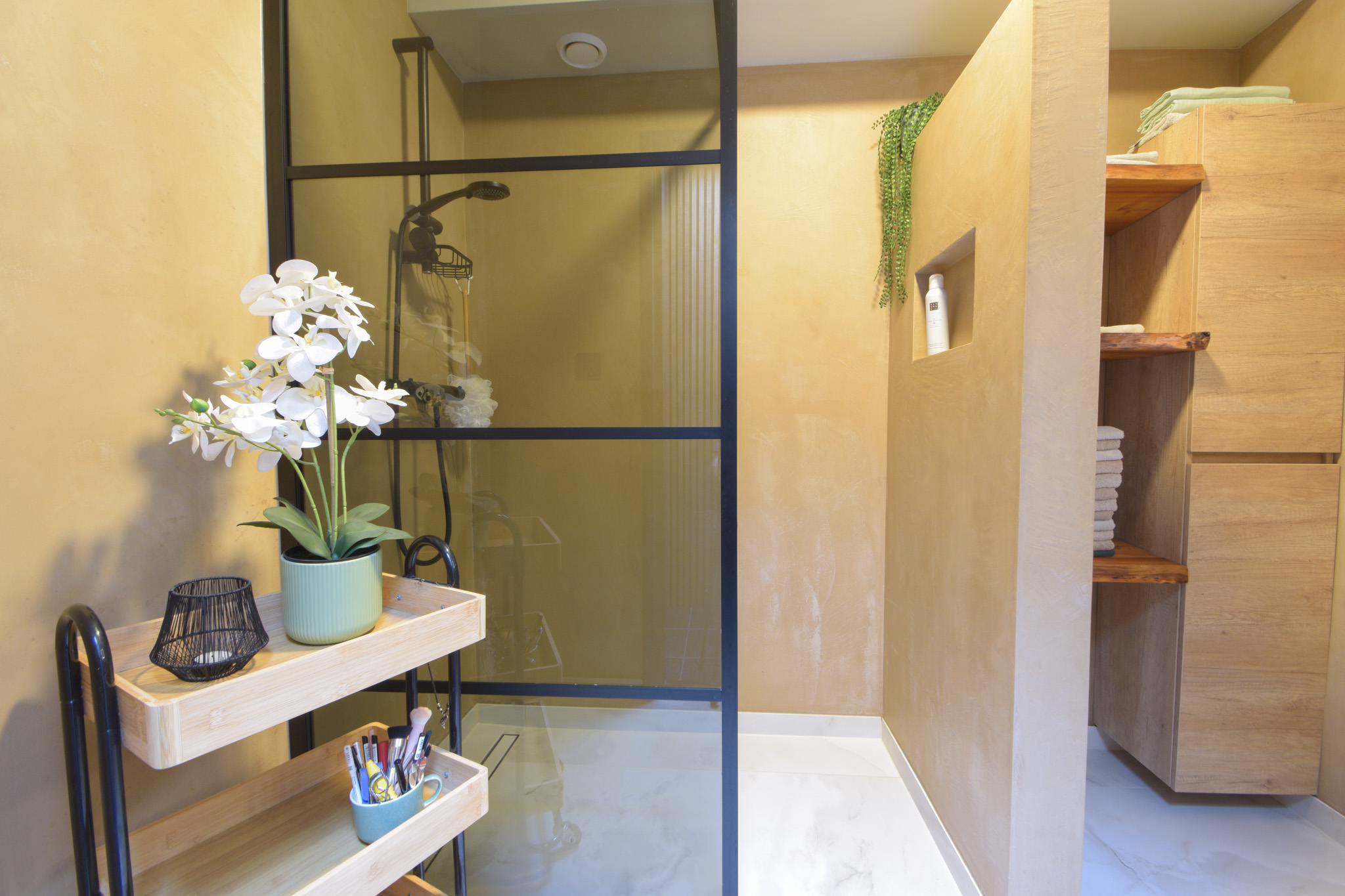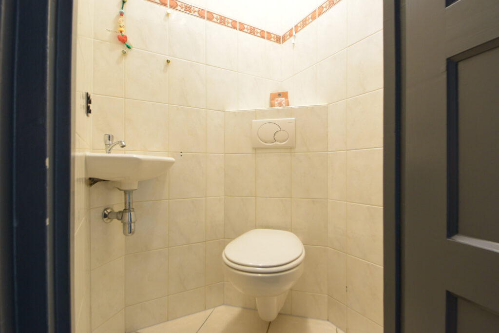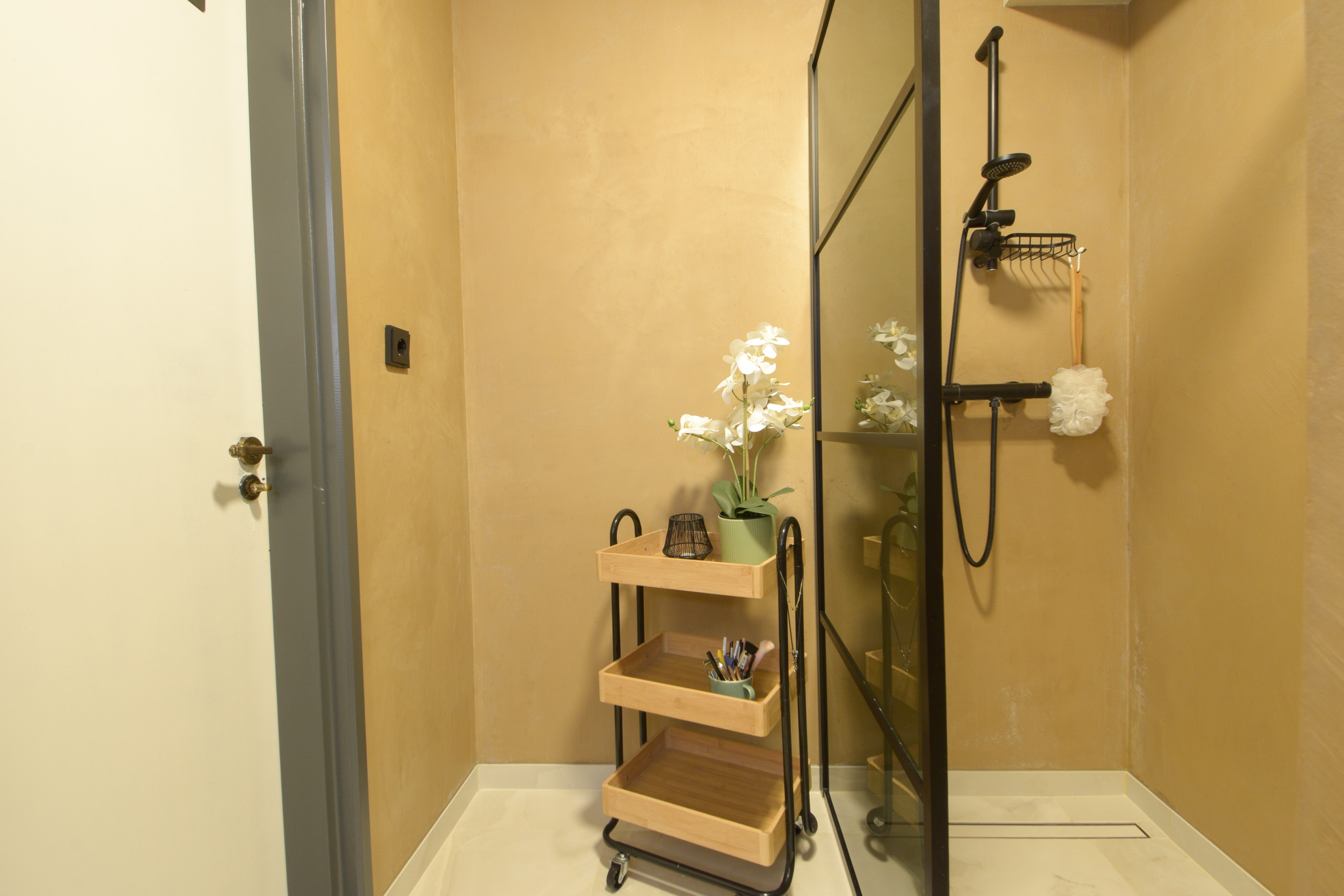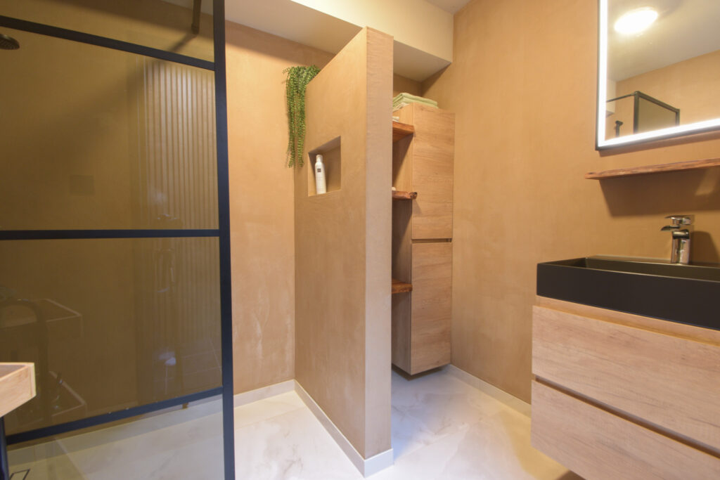 De badkamer bevindt zich op de begane grond en is in 2024 geheel vernieuwd met een inloopdouche, wastafelmeubel en met betonciré afgewerkte wanden.