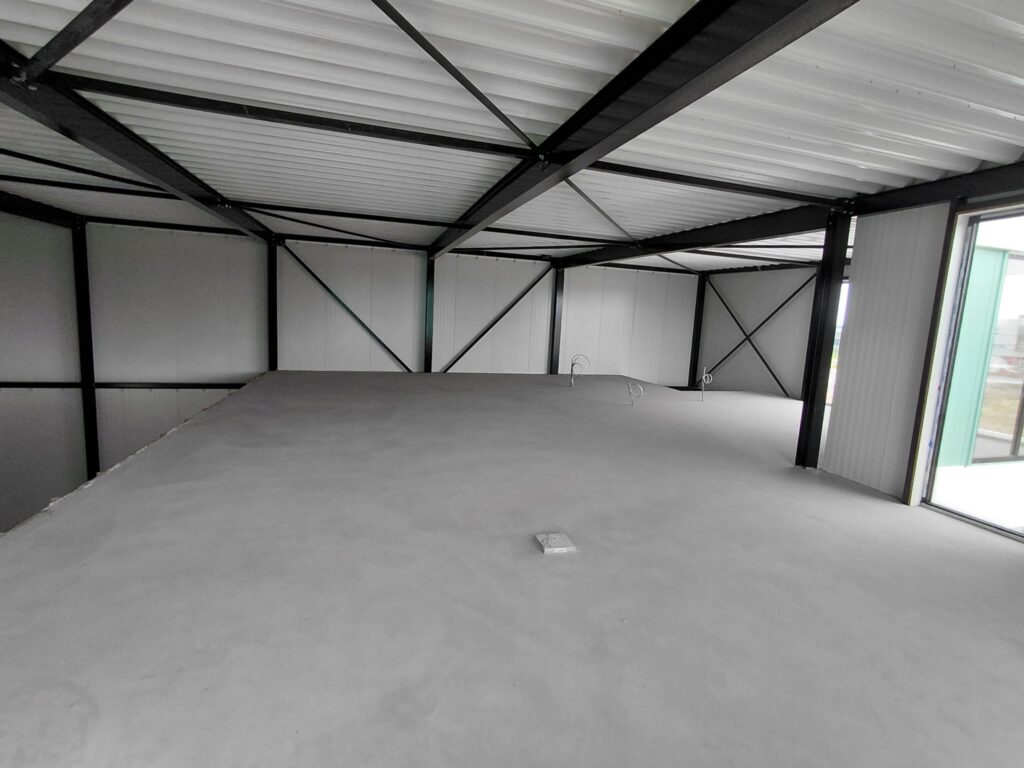 Vloeroppervlak totaal circa 400 m² (verdeeld over begane grond en verdieping), met op de begane grond een volledig onderheide en gewapende betonvloer, geschikt voor heftruckgebruik. De verdiepingsvloer is eveneens van beton.